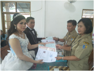 Penyerahan 7 dokumen hasil pencatatan perkawinan oleh Kabid Pelayanan Pencatatan Sipil Kabupaten Demak kepada pasangan pengantin Yupiter Maryanto dan Maria Elisa Pada tanggal 19 Agustus 2019 di Gereja Pepanthan Desa Mojosimo Kecamatan Gajah Kabupaten Demak Drs.Edy Sedyono Kabid Pelayanan Pencatatan Sipil, yang didampingi Budi Hendrowati Kasi Pencatatan Perkawinan, Perceraian, Perubahan Status Anak, dan Pewarganegaraan …