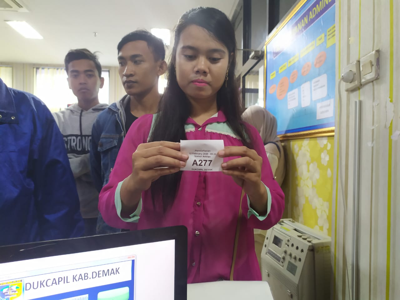 Demak – Pukul 09.15 WIB, Rabu (12/02/2020), Citra salah seorang pemohon administrasi kependudukan yang berasal dari Kecamatan Karangawen, Kabupaten Demak, mendapatkan nomor antrian 277 saat melakukan pendaftaran dokumen kependudukan di Dindukcapil Kabupaten Demak. Citra akan melakukan pencetakan KTP-el miliknya.