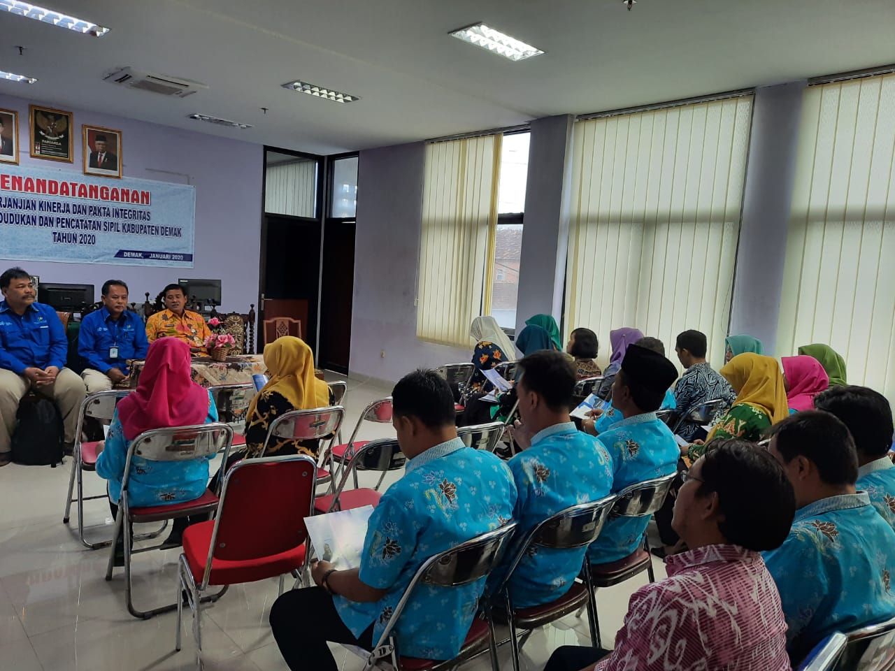 Demak – Kepala BPS Kab. Demak, Sapto Harjuli Wahyu, S.Si dan tim mendatangi Dindukcapil Kab. Demak pagi ini (19/02/2020) untuk melakukan Sosialisasi Sensus Penduduk 2020 “Sepuluh Tahun Sekali #MencatatIndonesia” kepada seluruh pegawai Dindukcapil Kab. Demak. Tim BPS Kab. Demak didampingi oleh Kepala Dinas Kependudukan dan Pencatatan Sipil Kab. Demak, Drs. M. Afhan Noor, M.Pd menjelaskan mengenai langkah-langkah melakukan Sensus Penduduk dan Manfaat Data SP 2020.