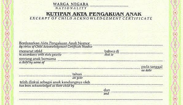 Pengakuan anak hanya berlaku bagi anak yang orang tuanya telah melaksanakan perkawinan sah menurut hukum dan agama, tetapi belum sah menurut hukum Negara. Berdasarkan laporan tersebut Pejabat Pencatatan Sipil mencatat pada Register Akta Pengakuan Anak dan menerbitkan Kutipan Akta Pengakuan Anak.