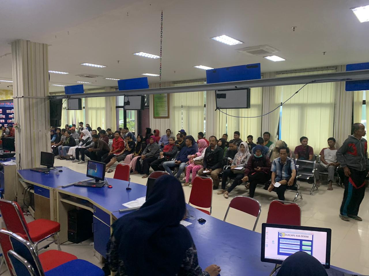Demak – Hujan di hari Kamis ini (05/03/2020) tidak menghalangi antusiasme warga yang akan mengurus dokumen administrasi kependudukan milik mereka di Dinas Kependudukan dan Pencatatan Sipil Kab. Demak. Pukul 07.30 WIB saat pelayanan masih belum dibuka, antrian sudah terlihat padat.