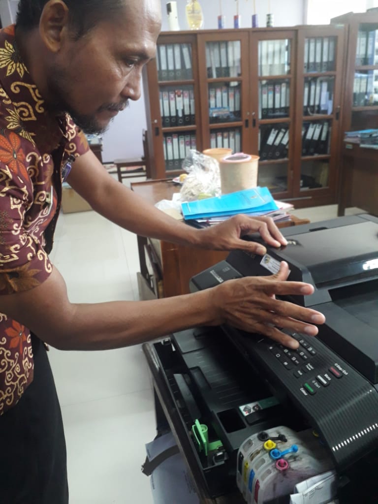 Demak – Selain melakukan pelabelan atau inventarisasi di mesin finger print, Pengelola Pemanfaatan Barang Milik Daerah Dinas Kependudukan dan Pencatatan Sipil Kab. Demak, Akhmad Suyikno, S.Sos juga melakukan inventarisasi printer yang memiliki multi fungsi yaitu scanner dan fotocopy. Printer bermerk Brother tersebut terletak di Ruang Sekretariat Dindukcapil Kab. Demak.