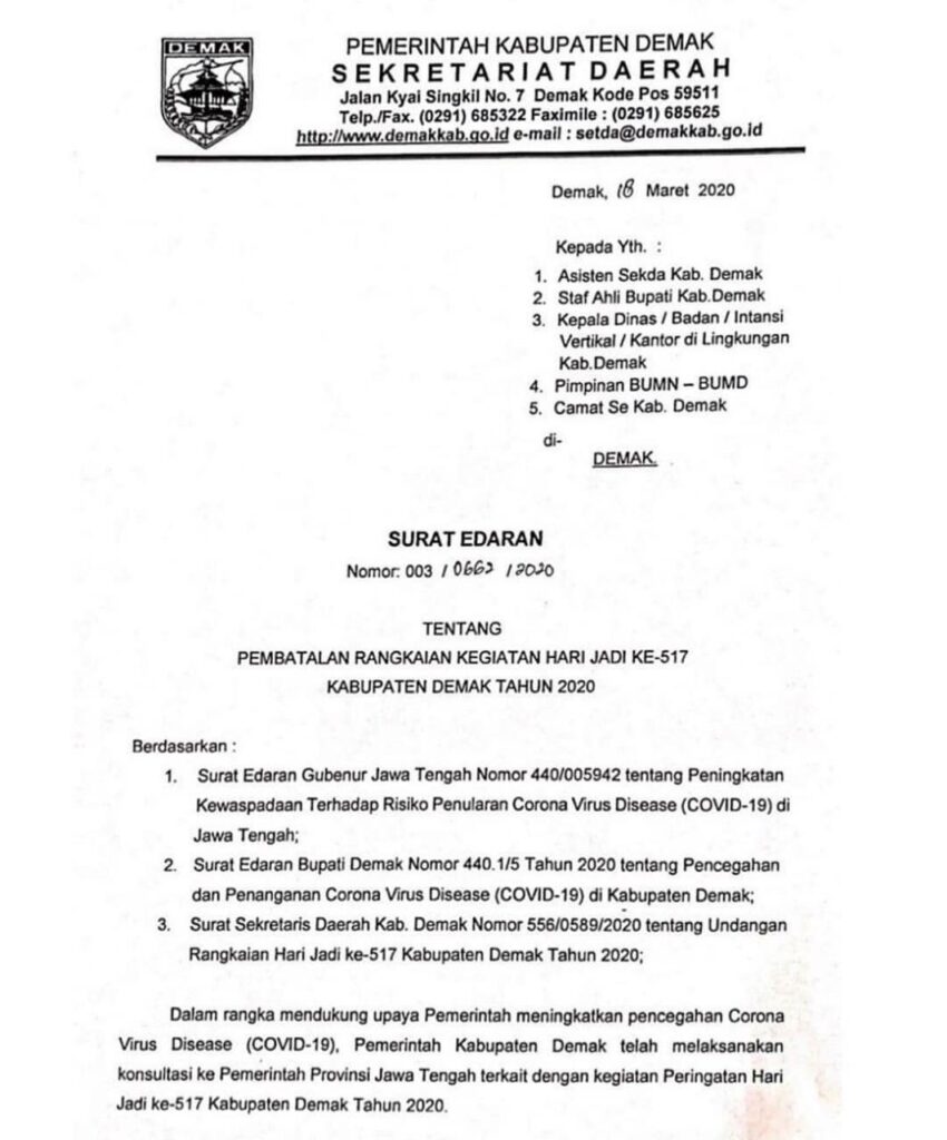 tentang “PEMBATALAN RANGKAIAN KEGIATAN HARI JADI KE-517 KABUPATEN DEMAK TAHUN 2020”
