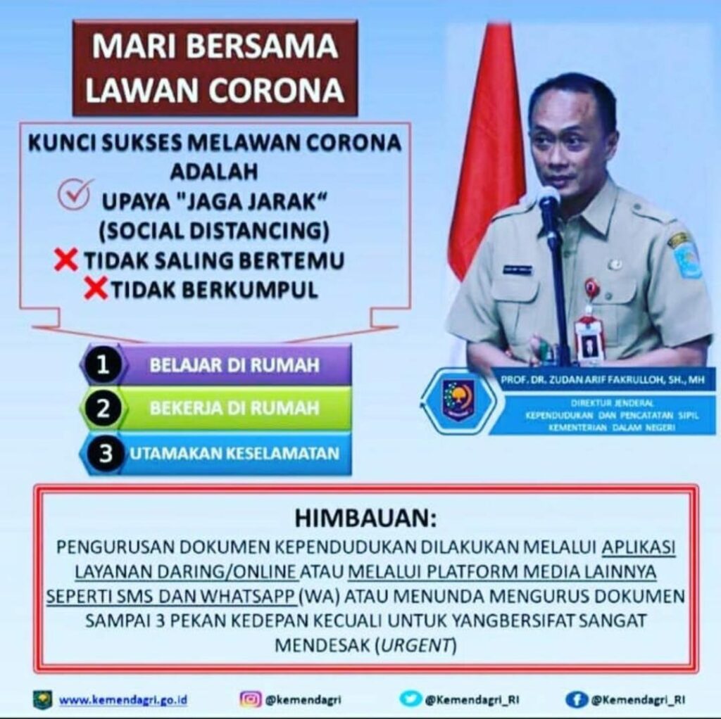 Demak – Prof. Dr. Zudan Fakhrulloh, SH, MH, Dirjen Kependudukan dan Pencatatan Sipil Kementerian Dalam Negeri Republik Indonesia telah menghimbau bahwa kepengurusan dokumen kependudukan dilaukan melalui aplikasi layanan daring atau online, atau bisa melalui platform media lainnya, seperti SMS dan Whatsaap (WA). Masyarakat dihimbau untuk menunda mengurus dokumen sampai 3 pekan kecuali jika ada kebutuhan yang bersifat mendesak.