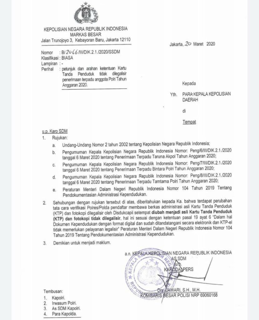 Dan Hal tersebut sudah ditindaklanjuti oleh Kapolri, melalui As.SDM, Karoda Pers mengeluarkan Surat Edaran ditujukan kepada seluruh Kapolda di Indonesia mengenai petunjuk dan arahan ketentuan KTP-el yang tidak dilegalisir dalam penerimaan terpadu terpadu Anggota Polri Tahun Anggaran 2020. Untuk itu jika waktu pendaftaran masuk Polri atau TNI masih ada petugas penerimaan meminta Dokumen adminduk yg dilegalisir, diminta untuk memperlihatkan surat ini dan membaca poin 2.
