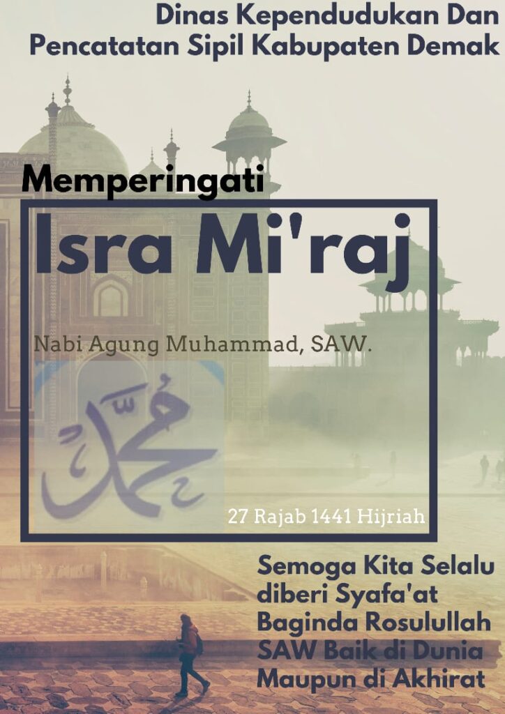 Demak – Segenap Karyawan dan Karyawati Dinas Kependudukan Dan Pencatatan Sipil Kabupaten Demak mengucapkan Selamat Memperingati Isra’ Miraj Nabi Muhammad SAW 27 Rajab 1441 H.(22 Maret 2020 M) .