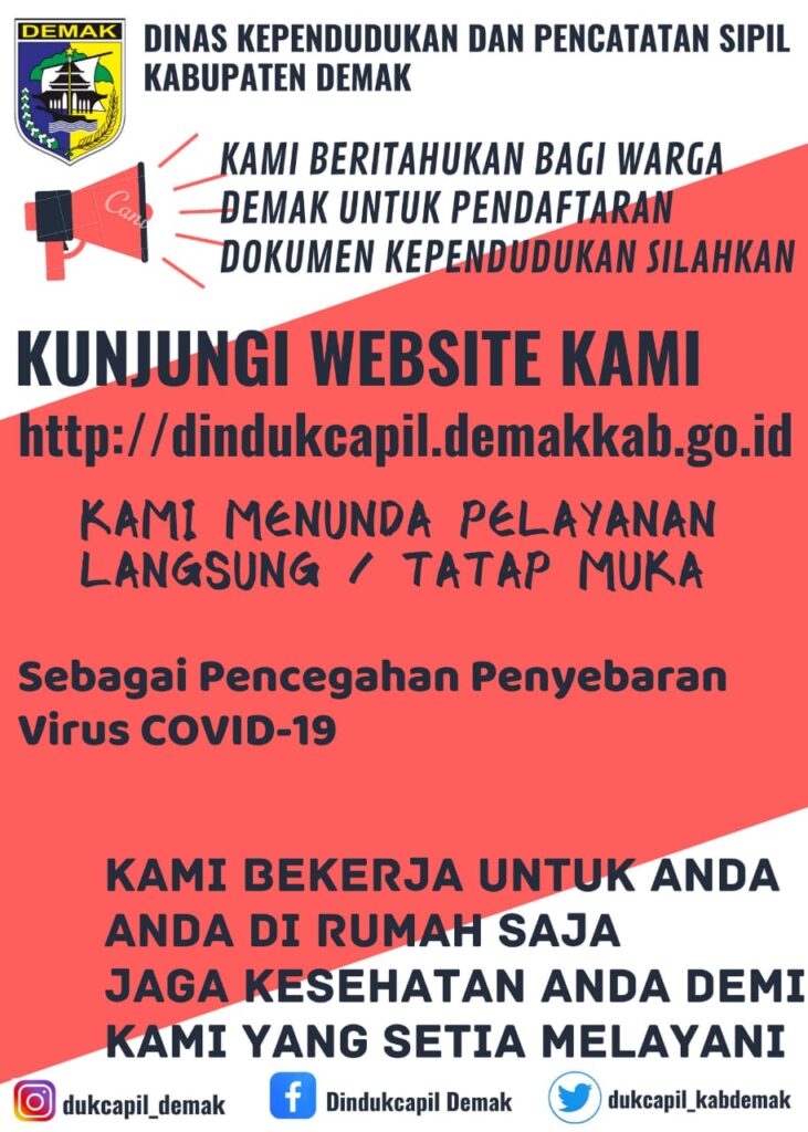 Demak – Mengantisipasi penyebaran Corona Virus Disease (Covid-19), Dinas Kependudukan dan Pencatatan Sipil Kabupaten Demak mulai tanggal 20-31 Maret 2020 menunda pelayanan langsung atau tatap muka termasuk pelayanan perekaman KTP elektronik maupun legislasi dokumen. Layanan tatap muka hanya berlaku bagi pengurusan BPJS atau rumah sakit yang sifatnya mendesak. Sebagai gantinya, masyarakat diminta untuk memaksimalkan pelayanan administrasi kependudukan secara online melalui website : www.dindukcapil.demakkab.go.id.
