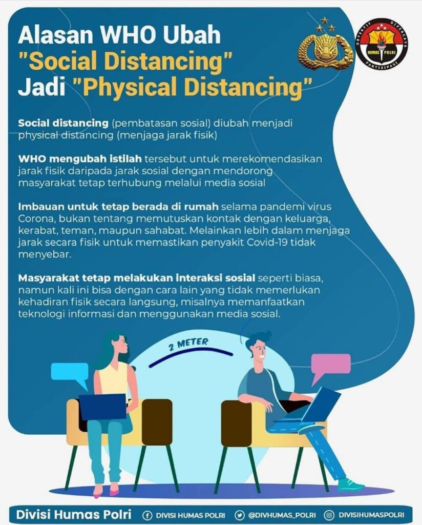 Demak – Alasan WHO Ubah “Social Distancing” Jadi “Physical Distancing” Social distancing (pembatasan sosial) diubah menjadi physical distancing (menjaga jarak fisik). WHO mengubah istilah tersebut untuk merekomendasikan jarak fisik daripada jarak sosial dengan mendorong masyarakat tetap terhubung melalui media sosial.