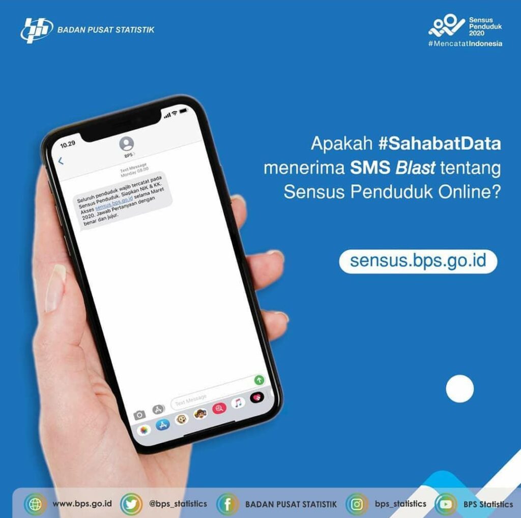 Demak – BPS tak kenal lelah untuk mengingatkan penduduk Indonesia agar berpartisipasi dalam Sensus Penduduk Online. Beragam caranya. Salah satunya melalui SMS Blast. Atas dukungan dari, Kementerian Komunikasi dan Informatika, SMS sudah mulai dikirimkan ke handphone masyarakat di seluruh Indonesia sejak 23 Maret lalu. Apakah di antara sahabat dukcapil ada yang sudah menerima?