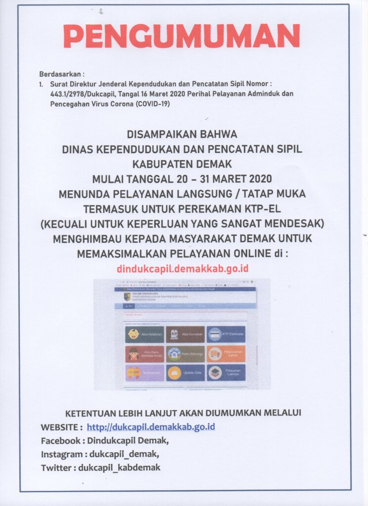 Dengan adanya pelayanan online yang kami lakukan saat ini adalah juga bagian dari ikhtiar kami, tapi hal ini tidak akan bisa terlaksana dengan baik jika tidak ada kerjasama yang baik dari njenengan semua. Dari pertama pemberitahuan ini kami sampaikan, ternyata masih dan semakin bertambah banyak yang mengurus dokumen kependudukan. Mohon maaf, bukan kami tidak mau melayani warga Demak, tapi mohon juga pengertian dari warga Demak Mohon lebih bijak lagi dalam memilah dokumen kependudukan apa yang memang sangat perlu diurus, dan yang masih bisa diurus di kemudian hari. Pilah apakah dokumen kependudukan itu akan segera digunakan, ataukah masih bisa ditunda. Semoga badai Corona segera berlalu.