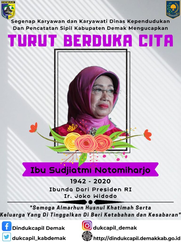 Demak – Kemarin (25/03/2020) Seluruh Karyawan dan Karyawati Dindukcapil Kab. Demak mengucapkan turut berduka cita sedalam-dalamnya atas berpulangnya ibu Sudjiatmi Notomiharjo, ibunda Presiden Republik Indonesia Joko Widodo.