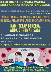 Demak – Mewabahnya Corona Virus Disease di Indonesia pada umumnya dan di Kabupaten Demak pada khususnya, telah membuat beberapa kantor yang berhubungan dengan pemberian pelayanan kepada masyarakat secara langsung untuk mengikuti kebijakan dari masing-masing institusinya. Salah satunya adalah Dindukcapil Kab. Demak, berdasarkan arahan dari Surat Edaran dari Dirjen Dukcapil Nomor 443.1/2978/Dukcapil, tanggal 16 Maret perihal …