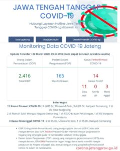 Demak – Update monitoring data Covid-19 Jawa Tengah 22 Maret 2020, 09.04 WIB (Data dapat berubah sewaktu-waktu) ini ODP sebanyak 2.416, PDP masih dirawat 164 orang, 14 Kasus positif dengan 11 dirawat, 0 sembuh dan 3 meninggal. Untuk itu dihimbau bagi masyarakat Jawa Tengah pada khususnya jika sedang Demam atau Pilek? Jangan Ragu Periksa ke …