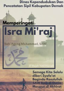 Demak – Segenap Karyawan dan Karyawati Dinas Kependudukan Dan Pencatatan Sipil Kabupaten Demak mengucapkan Selamat Memperingati Isra’ Miraj Nabi Muhammad SAW 27 Rajab 1441 H.(22 Maret 2020 M) .Mari membumikan ketauladan Rasulullah SAW ke seluruh aspek kehidupan bermasyarakat, berbangsa dan bernegara. Jadikanlah semangat peringatan Isra’ Miraj Nabi Muhammad SAW sebagai motivasi untuk menciptakan Generasi yang …