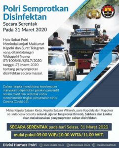 Polri Semprotkan Disinfektan Secara Serentak Pada Tanggal 31 Maret 2020
