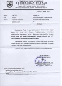 Demak – Kepala Dinas Kependudukan dan Pencatatan Sipil Kabupaten Demak, Drs. M. Afhan Noor, M.Pd berkoordinasi dengan Sekretaris Daerah Kabupaten Demak, dr. Singgih Setyono, M.Kes menindaklanjuti Peraturan Menteri Dalam Negeri Nomor 104 Tahun 2019 tentang Pendokumentasian Administrasi Kependudukan, bahwa dokumen kependudukan yang berformat digital dan ditandatangani secara elektronik dan KTP elektronik tidak perlu dilegalisir. Oleh …