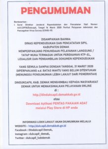 Dindukcapil Kab. Demak Memperpanjang Penundaan Pelayanan Langsung Hingga Waktu Yang Belum Ditentukan