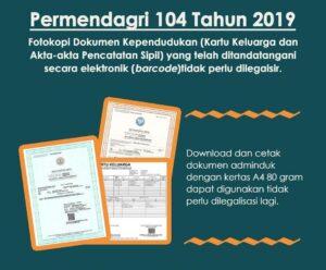 Demak – Minggu (29/03/2020). Sesuai dengan Peraturan Menteri Dalam Negeri Nomor 104 Tahun 2019, bahwa fotokopi dokumen kependudukan berupa Kartu Keluarga, KTP-el dan Akta-Akta Pencatatan Sipil yang telah ditandatangani secara elektornik atau dengan berupa barcode, tidak memerlukan legalisir lagi. Selain itu juga dijelaskan bahwa untuk mencetak dokumen administrasi kependudukan menggunakan kertas A4 80 gram dan …