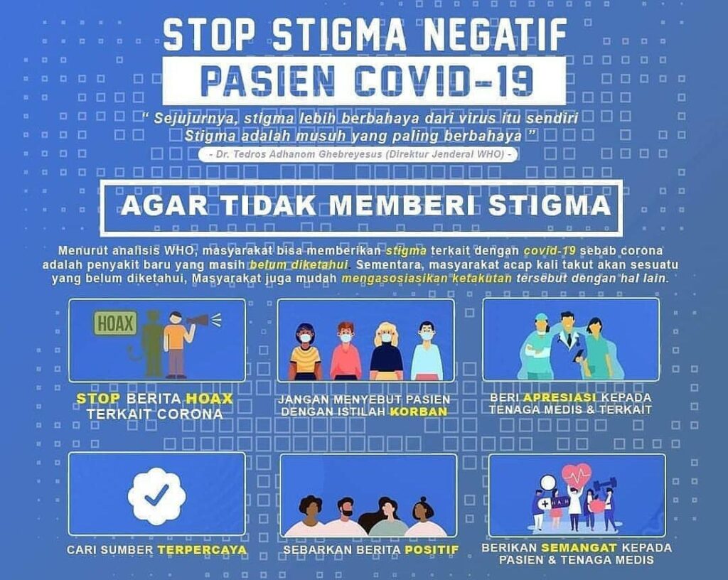 Dan menurut analisi WHO, masyarakat bisa memberikan stigma terkait dengan Covid-19 sebab corona adalah penyakit baru yang masih belum diketahui. Sementara masyarakat acap kali takut akan sesuatu yang belum diketahui. Masyarakat juga mudah mengasosiasikan ketakutan tersebut dengan hal lain. Berikut Tips agar kita tidak memberi stigma, stop berita hoax terkait corona, jangan menyebut pasien dengan istilah korban, beri apresiasi kepada tenaga medis dan terkait, cari sumber terpercaya, kemudian sebarkan berita positif dan terakhir berikan semangat kepada pasien dan tenaga medis. Stop Stigma, dan mari bersatu melawan Covid-19 di Demak.