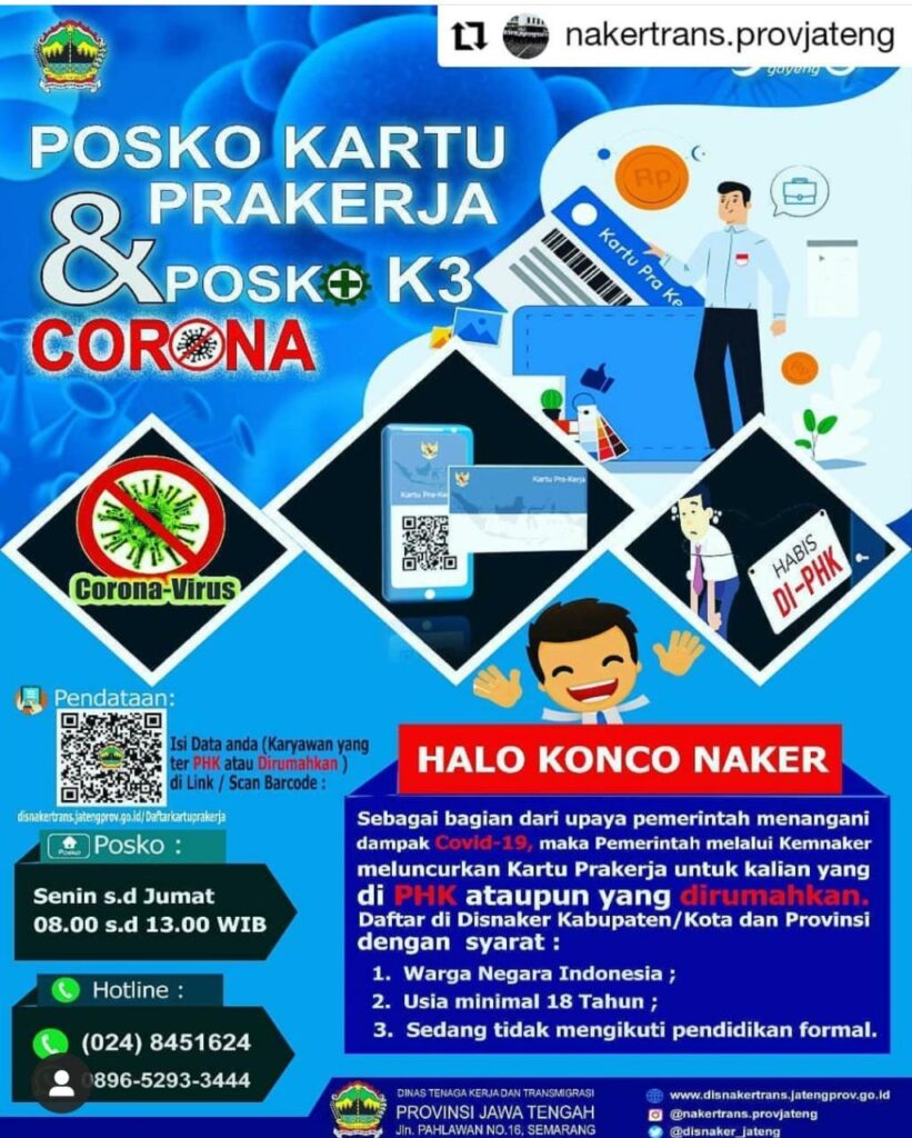 Demak – Rabu (08/04/2020). Ada kabar baik nih untuk Konco Naker, Dinas Tenaga Kerja dan Transmigrasi Jawa Tengah membuka pendataan Calon Penerima Kartu Prakerja, untuk kalian konco naker yang ter PHK ataupun yang dirumahkan karena dampak Covid 19. Caranya gampang, kalian bisa mendaftarkan diri melalui Dinas Tenaga Kerja Kabupaten/Kota maupun Disnaker Provinsi dalam link yang tertera (disnakertrans.jatengprov.go.id/Daftarkartuprakerja) ataupun posko yang disediakan.