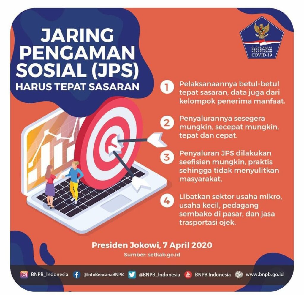Presiden Joko Widodo juga mengingatkan agar JPS harus tepat sasaran berdasarkan data serta penyalurannya secepat dan seefisien mungkin. Untuk melibatkan sektor usaha mikro, usaha kecil, pedagang sembako di pasar dan jasa transportasi ojek. (sumber : Setkab.go.id).