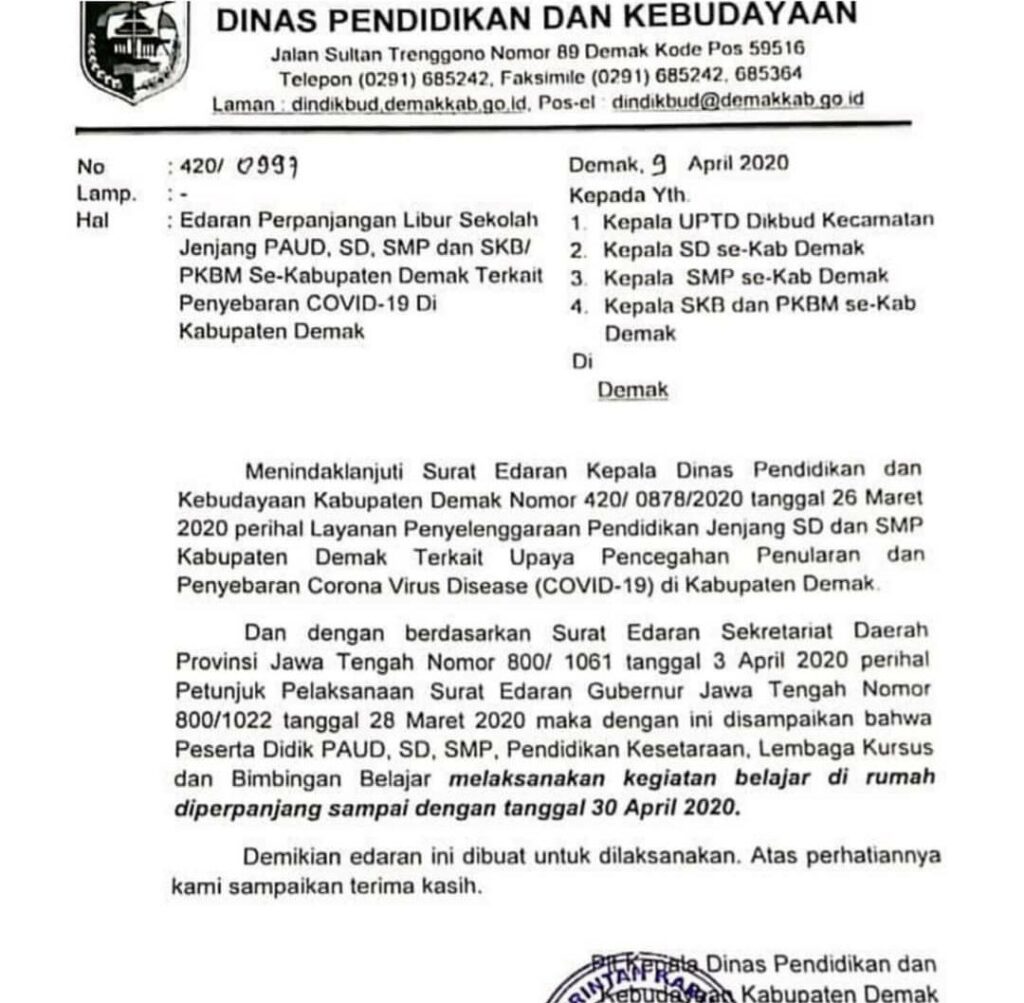 Demak – Dilansir dari Dindikbud Kab. Demak. Surat Edaran Perpanjangan Libur Pencegahan Covid19 untuk Satuan Pendidikan Jenjang PAUD, SD, SMP dan DIKMAS Kabupaten Demak sampai dengan 30 April 2020, tetap dirumah saja belajar secara mandiri, tetap semangat dan Semoga Sehat Selalu