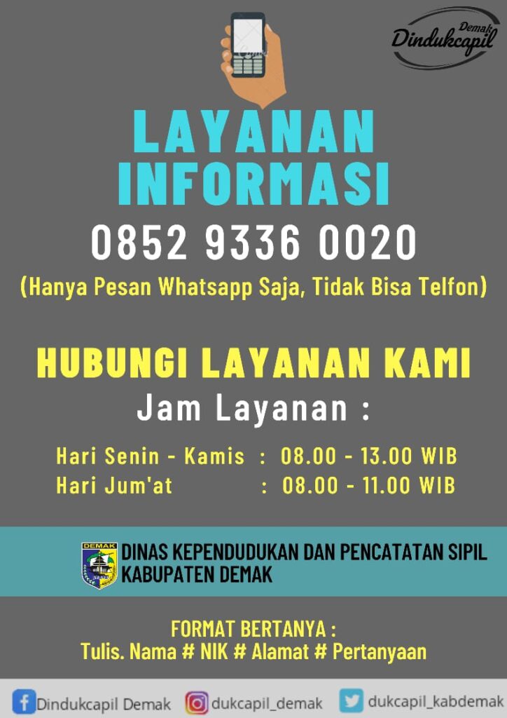 Demak – Rabu (15/04/2020) Untuk Layanan Informasi Seputar Pertanyaan Administrasi Kependudukan Secara Online, Pengaduan atau permasalahan-permasalahan tidak mendapat kode verifikasi dan yang berhubungan dengan dokumen kependudukan (Akta, KTP-el, KIA, Surat Pindah, Update Date Kependudukan) Silahkan hubungi nomor 0852 9336 0020 diwaktu Jam Kerja (08.00 – 15.30) dan Hari Kerja (Senin s.d Jumat).