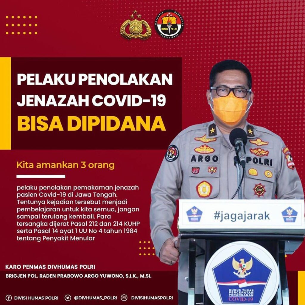 Demak – Sebagaimana dilansir dari Divisi Humas Polri, Kamis (16/04/2020). Pelaku Penolakan Jenazah Covid-19 Bisa Dipidana “Kita amankan 3 orang pelaku penolakan pemakaman jenazah pasien Covid-19 di Jawa Tengah. Tentunya kejadian tersebut menjadi pembelajaran untuk kita semua, jangan sampai terulang kembali.”, ujar Karo Penmas Divhumas Polri, Brigjen Pol. Raden Prabowo Argo Yuwono, S.I.K., M.Si.