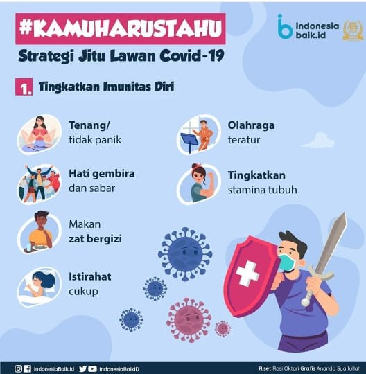 Kalian juga harus berdisiplin baik secara individu ataupun kolektif, dengan cara tetap di rumah, memakai masker, hindari pegang muka, rutin cuci tangan memakai sabun dan pshycal distancing atau menjaga jarak sosial minimal 1 meter. Saling bekerja sama dengan pemerintah pusat hingga daerah untuk memutus mata rantai penyebaran covid 19.
