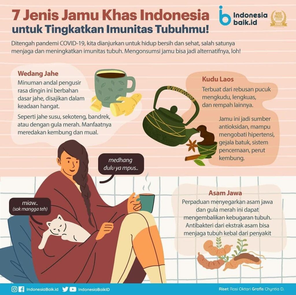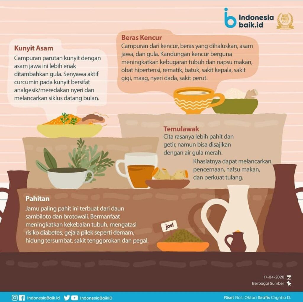 Jamu yang bisa dikonsumsi adalah wedang jahe, kudu laos, asam jawa, kunyit asam, beras kencur, temu lawak, pahitan. Nah, kalau sahabat Dukcapil, suka minum jamu apa nih?