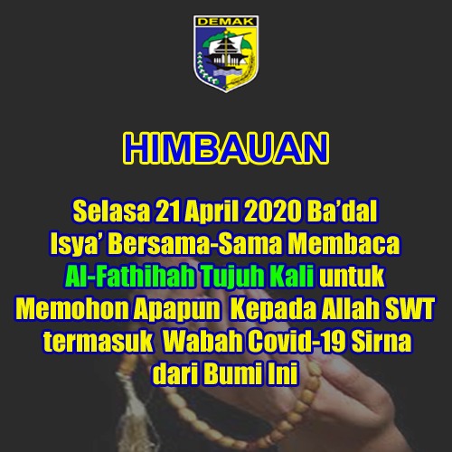 Demak – Selasa (21/04/2020). Sahabat Dukcapil, mari kita laksanakan himbauan dari Bupati Demak HM Natsir supaya hari Selasa, 21 April 2020 Ba’dal Isya kita bersama – sama membaca Al-Fatihah Tujuh Kali.