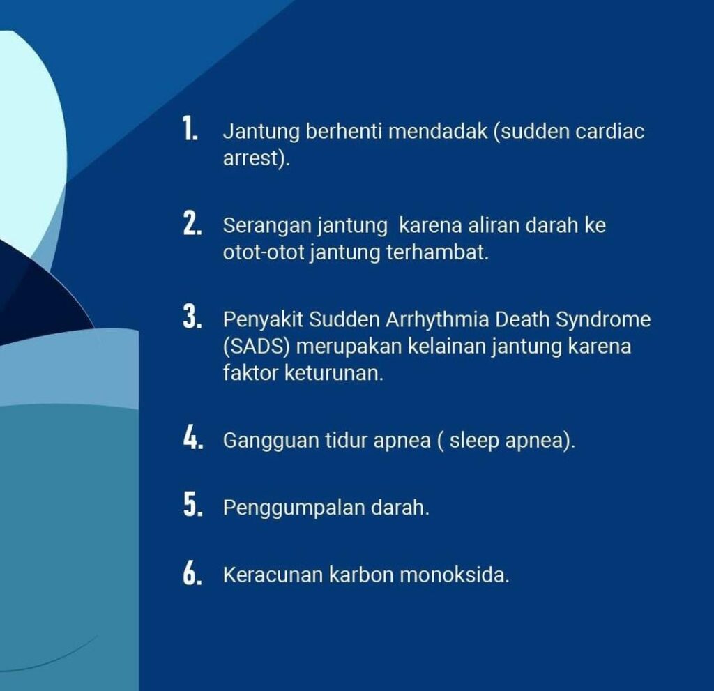 Demak – Dilansir dari Kompas (Selasa, 28/04/2020). Dari beberapa kejadian, sebelum orang meninggal saat tidur, kondisi mereka baik-baik saja atau tidak menunjukkan gejala sakit. Namun, di balik kondisi tersebut biasanya biasanya ada gejala penyakit tertentu.
