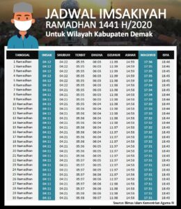 Demak – Jumat (24/04/2020). Jadwal Imsakiyah Ramadhan 1441 H (2020) untuk wilayah Kabupaten Demak dan sekitarnya. Selamat menunaikan ibadah puasa bulan ramadhan, Marhaban Yaa Ramadhan. Selamat menjalankan Ibadah Puasa Ramadhan. Semoga semua amal Ibadah kita diterima oleh Allah SWT. Jangan lupa, selalu berdoa semoga musibah ini lekas berlalu.