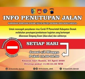 Demak – Jumat (24/04/2020). Melihat jumlah orang yang terinfeksi Virus Corona COVID19 cenderung terus meningkat, dan sebagai upaya pencegahan penyebaran Virus Corona (Covid-19). Berdasarkan Surat Edaran Bupati Demak Nomor 440.1/7 tahun 2020, Pemerintah Kabupaten Demak bersama Polres Demak memberlakukan, “PENUTUPAN DAN PENGALIHAN ARUS LALIN”. Di kawasan Alun – Alun Demak (Simpang Enam) dan sekitarnya. Efektif dilaksanakan mulai tanggal …