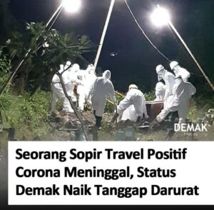 Demak – Satu pasien positif corona di Kabupaten Demak yang diketahui merupakan seorang sopir travel asal Desa Turirejo Kecamatan Demak terkonfirmasi meninggal, Jumat 24/4/2020. Dengan demikian status Demak dinaikkan menjadi tanggap darurat. Juru Bicara Gugus Tugas Penanganan Percepatan Covid 19, dr. Singgih Setyono M.Kes. mengatakan, satu Pasien Positif corona di Demak meninggal hari jumat berprofesi …