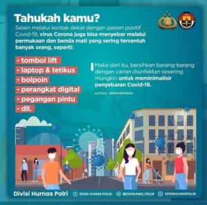 Demak – Sabtu (18/04/2020). Tahukah Kamu??? Selain melalui kontak dekat dengan pasien positif Covid-19, virus Corona juga bisa menyebar melalui permukaan dan benda mati yang sering tersentuh banyak orang, seperti: tombol lift, laptop & tetikus, bolpoin, perangkat digital, pegangan pintu – dll. Maka dari itu, bersihkan barang-barang dengan cairan disinfektan sesering mungkin untuk meminimalisir penyebaran …