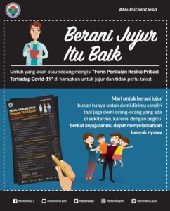 Demak – Selasa (07/04/2020). Sahabat Dukcapil Demak mari kita berani jujur, bukan hanya untuk dirimu sendiri tapi juga demi orang yg ada di sekitarmu. Karena dengan begitu, berkat kejujuranmu dapat menyelamatkan banyak nyawa. Untuk itu sahabat dukcapil Demak, mari kita isi “Form Penilaian Risiko Pribadi Terhadap Covid-19” dengan jujur. Sahabat Dukcapil Demak, tidak perlu takut. …