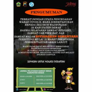 Demak – Terkait Dengan Upaya Pencegahan Wabah Covid -19, maka di beritahukan kepada seluruh wajib Pajak di Kabupaten Demak Bahwa Pelayanan Samsat Keliling, Samsat Car Free Day, dan Samsat Malam DITIADAKAN SEMENTARA terhitung Mulai Tanggal 31 Maret 2020 Hingga Pemberitahuan Lebih Lanjut. Sehingga wajib pajak kendaraan bermotor dapat melakukan pembayaran di Samsat Induk Kabupaten Demak, …