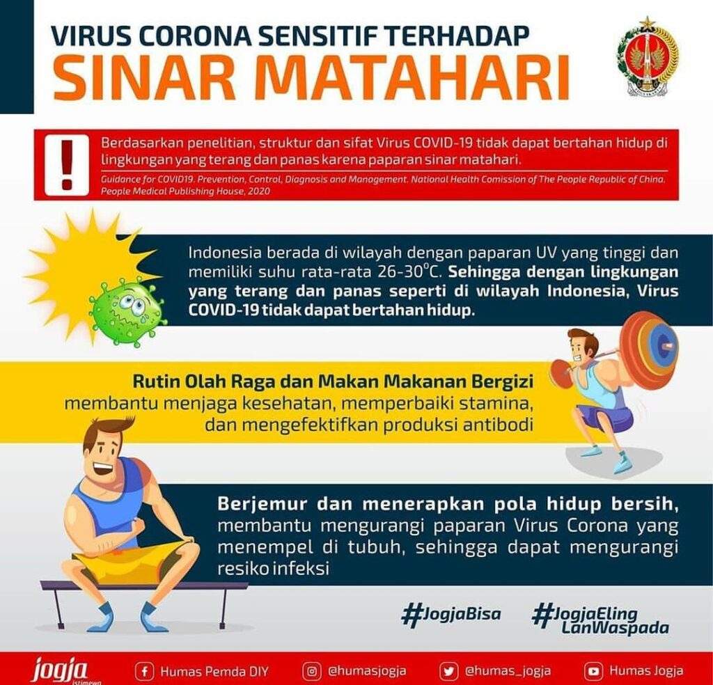 Demak – Senin (4/5), Berdasarkan penelitian, struktur dan sifat Virus Corona (COVID-19) tidak dapat hidup di lingkungan yang terang dan panas karena matahari (sinar UV). Rutin berolahraga dan makan makanan yang bergizi juga dapat membantu tubuh kita untuk tetap sehat, memperbaiki stamina dan mengefektifkan produksi antibodi. Selain itu, sedulur juga dapat berjemur dibawah sinar matahari dan menerapkan pola hidup bersih agar dapat mengurangi resiko infeksi yang disebabkan COVID-19.
