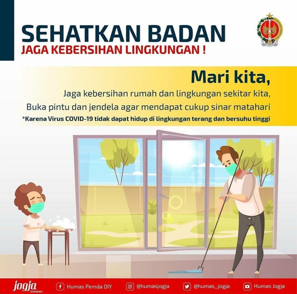 Mari, kita jaga kebersihan rumah dan lingkungan kita. Jangan lupa untuk mendapat sinar matahari yang cukup untuk mengurangi resiko penyebaran COVID-19.