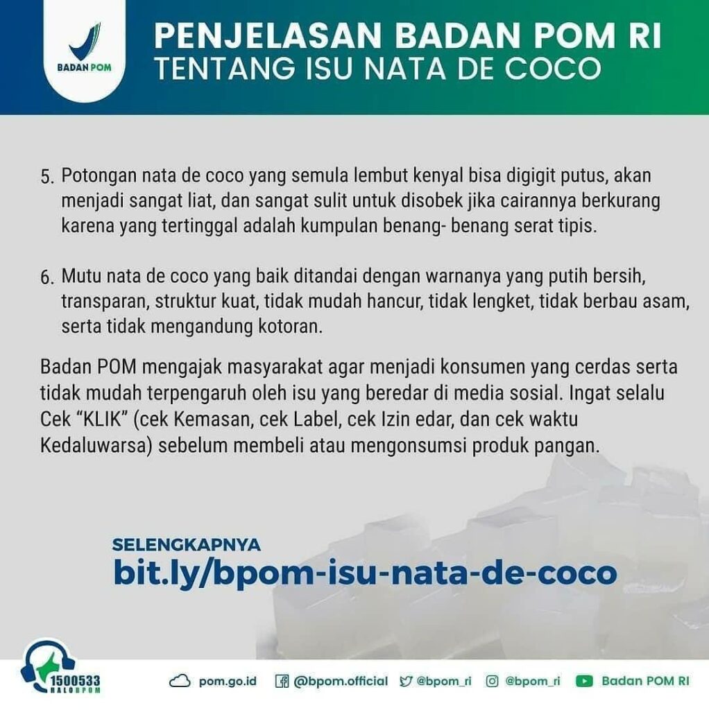 Informasi lengkapnya bisa diakses oleh Sahabat Dukcapil melalui link: bit.ly/bpom-isu-nata-de-coco . Jadi jangan percaya dulu mengenai isu yang beredar ya Sahabat Dukcapil.