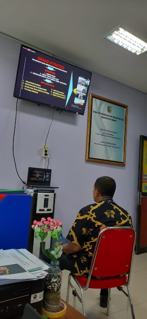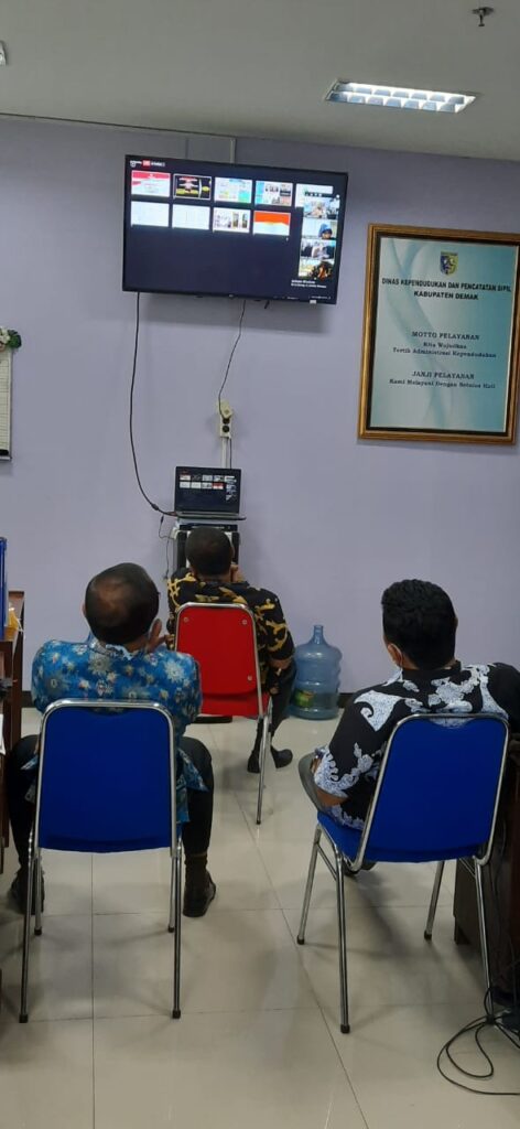 Dindukcapil Kab. Demak yang mengikuti live webinar adalah Kepala Dinas Dukcapil Kab. Demak, Drs. M. Afhan Noor, M.Pd beserta Kabid Pelayanan Pendaftaran Penduduk, Rustiyono, S.Sos, dan Kabid PIAK dan Pemanfaatan Data, Rudy Hartono, S.IP. Pada webinar tersebut, Zudan menjelaskan grand strategi pelayanan yang membahagiakan masyarakat, antara lain strategi digitalisasi, sikat pungli dan calo, kepastian waktu dan tempat ambil dokumen. Implementasinya yaitu, pelayanan daring, cetak dokumen di rumah atau ADM, cetak dokumen dengan kertas HVS 80gr, TTE pada dafduk, SOP Pelayanan, Umumkan dokumen kependudukan dan tidak cetak surat keterangan.