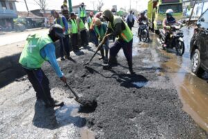 Demak – Sejumlah petugas nampak berjaga di lokasi banjir rob kawasan Sayung, Kabupaten Demak, Sabtu (16/5/2020). Beberapa petugas kepolisian berjaga dan mengatur lalulintas. Terlihat pula petugas Dinas Perhubungan yang ikut membantu. Pekerja proyek perbaikan saluran juga semakin banyak. Jika saat Ganjar marah-marah sehari sebelumnya hanya sekitar 5 orang petugas, hari ini pekerjanya sudah semakin banyak. …