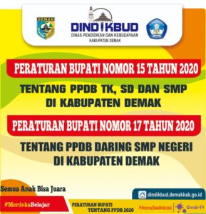 Demak – Kamis (28/5), Dilansir dari Dindikbud Kab. Demak, Peraturan Bupati Demak Nomor 15 Tahun 2020 tentang Penerimaan Peserta Didik Baru Pada Taman Kanak-Kanak, Sekolah Dasar dan Sekolah Menengah Pertama di Kabupaten Demak. dan Peraturan Bupati Demak Nomor 17 Tahun 2020 tentang Penerimaan Peserta Didik Baru Dalam Jaringan Pada Sekolah Menengah Pertama Negeri di Kabupaten …