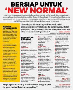 Istilah new normal life atau kondisi normal yang baru merupakan kondisi ketika manusia pada akhirnya harus hidup berdampingan atau beradaptasi dengan ancaman virus corona.Penggunaan masker dan melakukan cuci tangan kini menjadi hal yang wajib saat berada di ruang publik, pelaku usaha seperti restoran juga mulai mengatur jarak meja makan dan membatasi jumlah pengunjung tetap dilakukan …