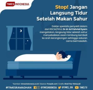 Demak – Saat puasa puasa Ramadhan, kita disarankan untuk makan sahur sebelum imsak menjelang subuh. Sahur memang membuat banyak orang melakukannya karena masih ngantuk. Tak sedikit orang yang memilih langsung tidur usai makan sahur karena tak mampu menahan rasa kantuknya. Tahukah Anda kalau langsung tidur setelah sahur bisa berdampak buruk pada kesehatan?