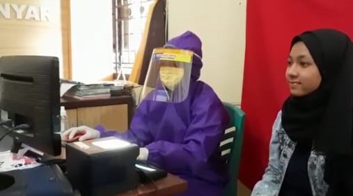 Begitu juga yang dilakukan oleh Endang Sulistyowati, Operator Dindukcapil Kab. Demak di TPDK Kecamatan Karangnanyar yang harus mengenakan APD (Alat Pelindung Diri) lengkap dalam melayani warga yang mengajukan perekaman KTP-el. Adalah Nisrina Salsabila, warga desa Kotakan Kecamatan Karanganyar yang pagi ini (2/6) mengajukan perekaman KTP-el supaya dapat diterbitkan KTP-el miliknya, karena Nisrina sudah berusia 18 tahun dan berhak mendapatkan KTP-el sebagai penunjang identitas diri yang harus dimiliki.