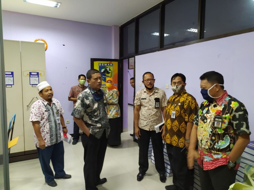 Demak – Kemarin (4/6), Tim Kabupaten Demak yang diwakili oleh Esti Adhi dari Inspektorat Kab. Demak dan Fatchul Imam, dari BPKPAD Kab. Demak meninjau ruang arsip di Dindukcapil Kab. Demak. Dengan didampingi langsung oleh Kepala Dinas Dukcapil Kab. Demak, Drs. M. Afhan Noor, M.Pd, dan pejabat Dindukcapil yang terdiri dari Kabid PIAK dan Pemanfaatan Data, Rudy Hartono, S.IP, Kabid Pelayanan Pencatatan Sipil, Ili Carli, SH dan Kabid Pelayanan Pendaftaran Penduduk, Rustiyono, S.Sos.