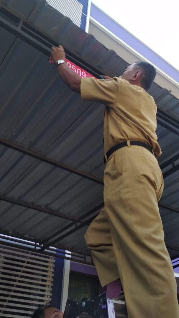 Demak – Salah satu pelaksana Dindukcapil Demak di Sub Bagian Sekretariat, Moh Sakdun, pagi ini (22/6) selepas apel pagi bersama di halaman Setda Kab. Demak, memasang tanda plat nomor pada garasi di halaman parkir Gedung Ungu. Pada garasi tersebut yang dipasang adalah plat mobil milik Kadin Dukcapil dan KaDindagkop UKM Demak serta Sekretaris Dindagkop UKM.