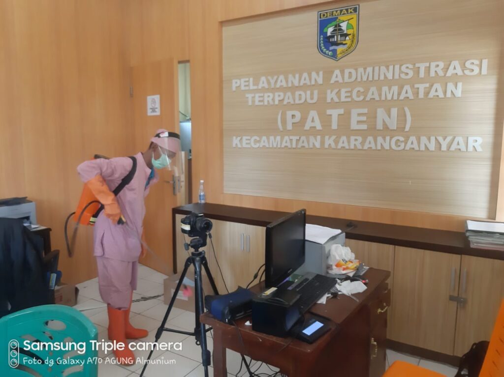 Demak – Dalam upaya pencegahan terhadap penyebaran Virus Corona (Covid-19) di wilayah Kecamatan Karanganyar, Kantor Kecamatan Karanganyar juga melakukan penyemprotan cairan disinfektan. Petugas yang melakukan penyemprotan disinfektan berasal dari Puskesmas Karanganyar.